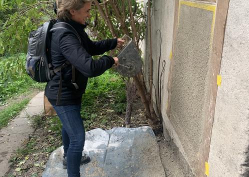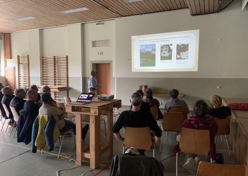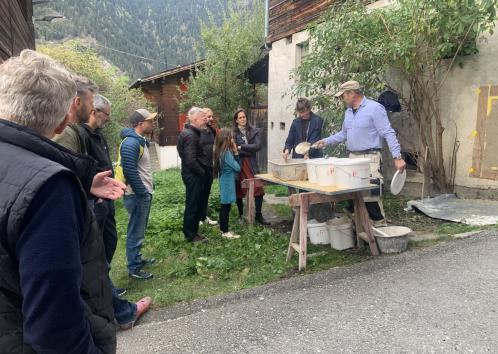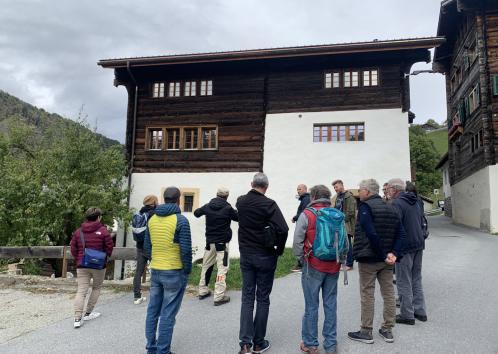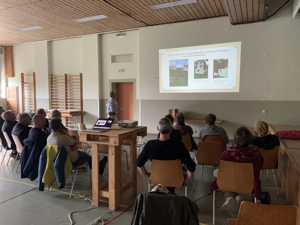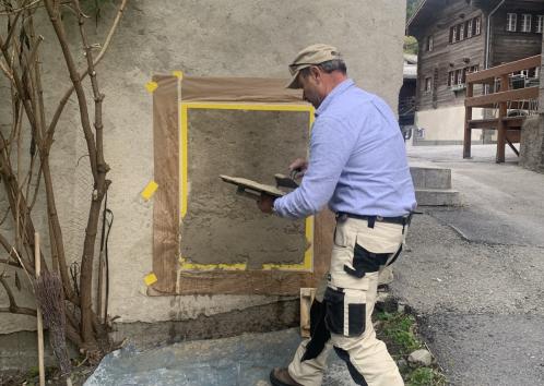 Der Verein VETA/NOVA hat sich bei seiner Forschungsarbeit für die Erstellung der Leitfäden auch intensiv mit dem Einsatz von Lehmputz bei der Sanierung von Altbauten auseinandergesetzt. Nutzen und Anwendungsmöglichkeiten verschiedener Lehmputz-Arten werden aktuell im Rahmen eines Folgeprojekts geprüft. Anlässlich der Fachwerkstatt informierten die Vereinsmitglieder Willy Jossen (Gipser-Handwerker in der Denkmalpflegea) und David Ritz (Architekt) im Dorfkern von Grengiols über das historische Handwerk und die verwendeten regionstypischen Materialien und Kalkputze. Damit will der Verein sensibilisieren und das traditionelle Wissen lebendig halten.